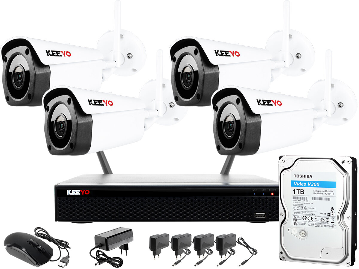 - Súprava: WIFI DVR, 4 WiFi IP kamery, 5 x napájací zdroj, myš