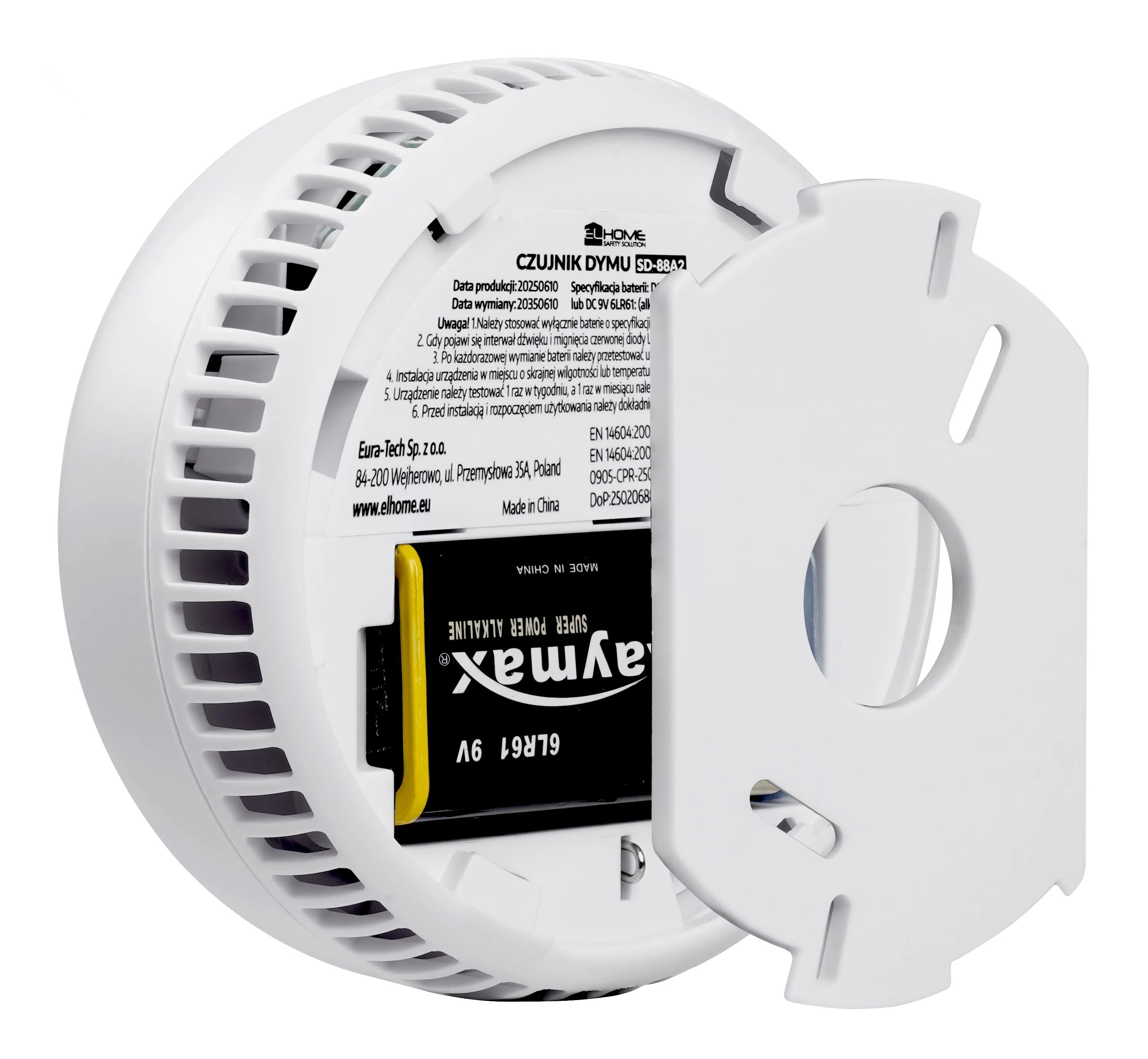 Czujnik dymu EL HOME SD-88A2 - bateryjny 9V DC, czujnik fotooptyczny, żywotność sensora 10 lat