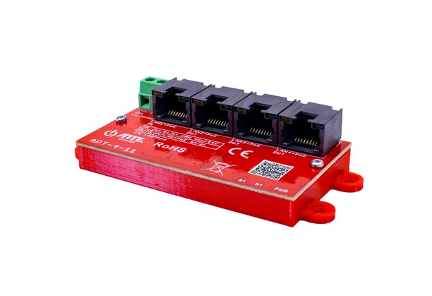 APT-4-11 posiada podstawę z poliwęglanu wyposażoną w otwory montażowe. Umożliwia montaż za pomocą kołków ADD-PIN w rastrze 10,8mm, który występuje w obudowach serii ABOX oraz blachach montażowych i adapterach wyposażonych w otworowanie. Urządzenie posiada stopień ochrony IP20, aby zapewnić ochronę przed wpływem czynników atmosferycznych oraz kondensacją wilgoci, wymagane jest zastosowanie odpowiedniej obudowy (minimum IP44).