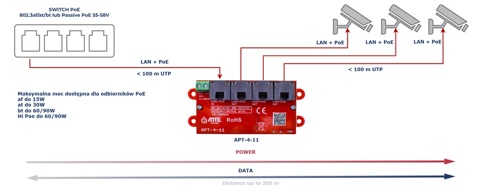 Urządzenie umożliwia nam zasilanie do 3 odbiorników PoE za pomocą jednego przewodu UTP. W sytuacjach, kiedy nie mamy możliwości doprowadzenie nowego przewodu lub doprowadzenie wiązałoby się z dodatkowymi kosztami, APT-4-11 pozwala nam na wykorzystanie istniejącego okablowania. APT-4-11 może pełnić rolę ekstendera sieci LAN + PoE w sytuacji, kiedy odległość pomiędzy urządzeniami przekracza 100m. Jeżeli jest możliwość podzielenia przewodu na odcinki poniżej 100m przewodu UTP pozwala na zwiększenie zasięgu sieci LAN bez konieczności podłączenia dodatkowego zasilania z zachowaniem pełnej przepustowości 100Mbps. Wbudowana funkcja LR150 (Long Range 150m) pozwala na stabilną pracę wszystkich portów do 150 metrów UTP z prędkością 100Mbps z zasilaniem PoE. Umożliwi to instalację kamer bez stosowania dodatkowego ekstendera pośredniego.